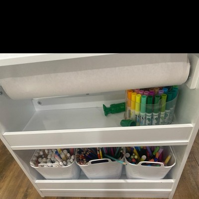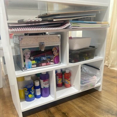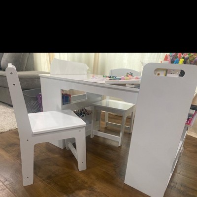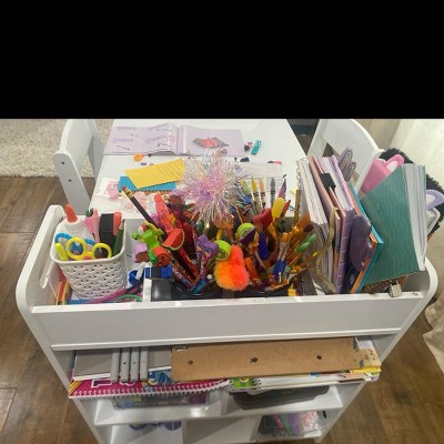 I wanted a table with storage for art supplies and big enough for my 6 and 8 yr old to sit at. My 6 yr old sits in it well. The chair is a little low for my 8 yr old's legs. However they are both able to sit and do homework at. It is a common place for my 8 yr old to do homework. There are a few things that are frustrating but we make it work. The storage on both sides are small for typical art supplies. The side with more storage does not have very wide shelves. How er I am not a fan of shelving that has built in sections. It really limits what you can store on them. The biggest annoyance is the opening to the paper roll is not the size of the rolls we had extra of. We had extra M&D paper rolls and that paper is a little too wide for this table. We make it work but it crinkles the sides. Once this roll is done I will look for a different roll of paper that will fit better into the opening. Hopefully there is something thinner. The finish of the table does absorb a bit. We've had other tables that markers or slime has not been wiped up right away and has come off. This one I try to wipe up quickly. Overall it works. It's the best one I could find that had some storage, tall enough for older kids and at a decent price.