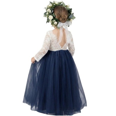 2Bunnies Girls' 12M-12Y Boho Country Rustic Lace Scalloped Trim Sleeve Flower Girl Dress Dusty Blue 12 months