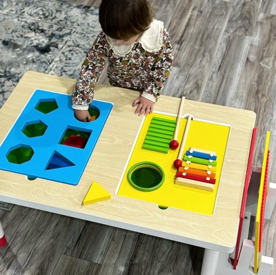 This is one of my toddlers favorite things to play with and she uses it daily! The interchangeable boards create endless amounts of fun and encourages my toddler’s development. The table is extremely durable and made with high quality material. Assembly was quick in easy.