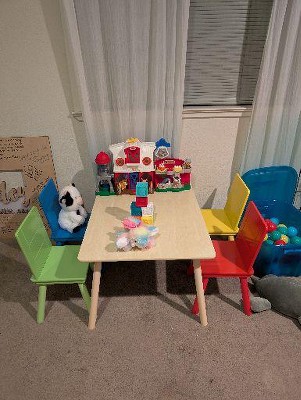 I nanny with my daughter and the family has this table. After reading reviews on others about chairs breaking or being built of weak materials I knew I needed to order the same table. The three kids absolutely abuse this thing and it is still perfect after months and months. It arrived so quick. I just built it and it was THE EASIEST piece of children's furniture I have ever built. 15 minutes tops. I got the multi color and love it. The chairs are so vibrant. The other family has blue and it also is great. Warning washable paint pens do not wash out of the table surface if you let them dry. If you want to keep the surface pristine you should wipe it daily. I could not recommend this table and chairs more whole heartedly.