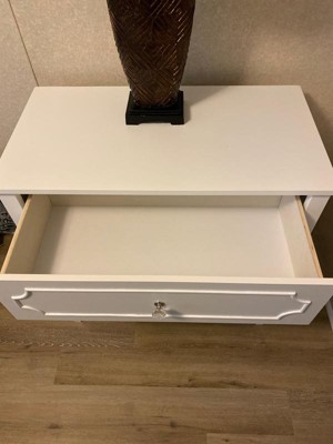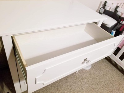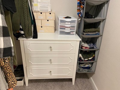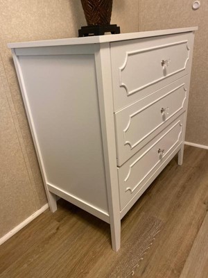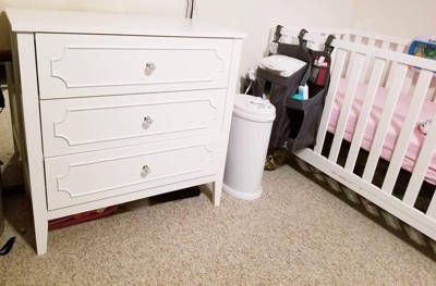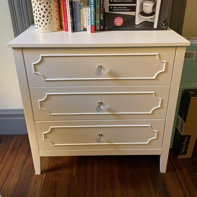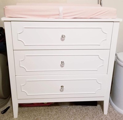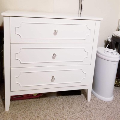[This review was collected as part of a promotion.] This dresser is beautiful with it’s pristine white color and clear jewel knobs. I have a white crib and this went perfectly with the elegant princess theme I am working on for my baby’s nursery. The drawers slide easily which is great for getting into one handed since I usually have my 3 month old baby in my hands. The drawers are roomy enough to keep all her clothes, blankets, crib sheets, towels, and burp cloths within the 3 drawers. The dresser looks great by itself, but I use mine as a changing table as well as the top is a perfect size to accommodate my changing pad. My husband was able to assemble the dresser in about 2 hours following the given directions. The only issue he had was there are 3 holes to attach the drawer to the track, but the middle hole doesn’t align if you do the 2 outer holes first, although it does not affect the functionality of the drawers at all. I highly recommend this dresser for any nursery or little girls room.