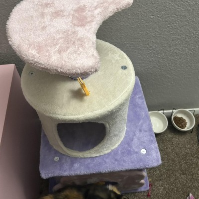 This is adorable but it is very small. I don’t mean that as in it’s a short cat tower, I mean if you have a fat cat they’re not gonna fit in it well. Mine is fat and will not fit. Seems to be made well otherwise. I added a photo of it beside the other cat tower I had to buy to replace this.