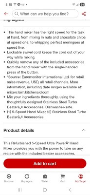 I really should’ve listened to these reviews… I wanted to get a hand mixer but couldn’t fully afford a brand new one, so I bought this refurbished one. Now I know that refurbished items can have flaws but are working. Well I received mine today and it’s literally missing the whisks. What is the point of having a mixer if it isn’t even able to mix things. Quite literally the worst purchase I’ve had from Target. If something is refurbished it should at least be able to serve its purpose and without the parts to mix, the mixer is pointless. 0/10 recommend.