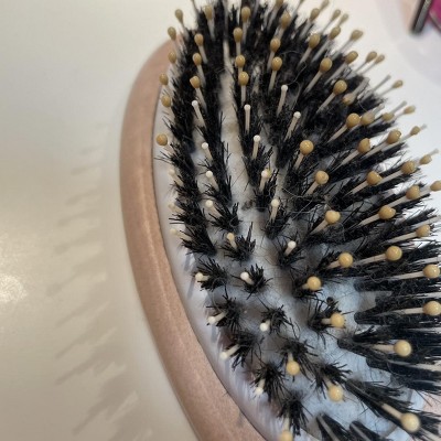 This is a great brush. The plastic bristles allow for my hair to properly get untangled and the boar bristles help with shine. I haven’t had any bristles break or fall out. Hair is very easy to remove.