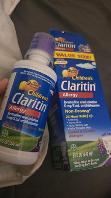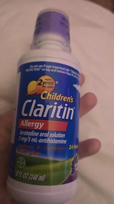Children's Claritin Syrup provides effective, 24-hour allergy relief of your child's allergy symptoms, like sneezing, runny nose and itchy, watery eyes. It is available in a grape flavor. Kid approved great taste. Antihistamine. For use by children ages 2+. Each 5 mL teaspoonful contains 5 mg of loratadine. Dye-free, sugar-free, alcohol-free.