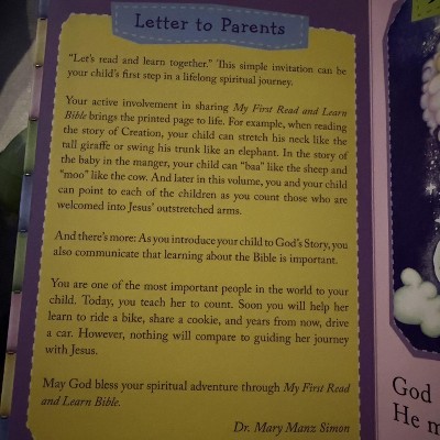 The “Letter to Parents” should stay neutral on gender as you don’t know if the children’s Bible is for a girl or a boy. I have 2 sons and you refer to the child as “her” THREE times. I can’t rip this page out and carry-on with keeping the book because it’s attached and binded to the cover of the book on the other side. Also, the cover is very deceitful: the cover image will make someone think that there will be a variety of shades of people throughout the book…it is not. The cover page has multiple shades and then you see this same image again on the very last page. The 29th page has 1 image with a Wise Man who is a different shade. Your cover page is mis-leading and looks like it was done on purpose. Very disappointed in this book as it will no longer be my child’s first Bible and as I make their baskets tonight, this Bible will not be included. I’m highly disappointed in this and I wish I had looked through this book sooner. I really wanted their first Bible to be this because it was ALSO a Scholastic book which would have been their FIRST Scholastic book…I purchased so many books from those Scholastic sales books when I was a kid. I’m so disappointed in this book. My kids will grow with their books, especially all books about Jesus so, these details are important to me, as my children have shown me how detail-oriented they are and I don’t want these things to become a question in the future. To be very clear: If everyone in the book were the same shade, I wouldn’t have a problem with that at all. Whether it was all light color or all dark color, it doesn’t matter. The cover is just way too mis-leading and yes it’s simple but more details needed to be shared in this “Bible”.