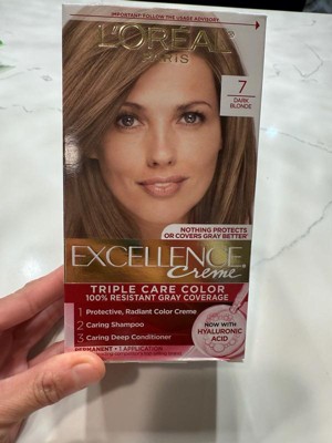 Very disappointed. I've been using Superior Preference #7 Dark Blond for many years. This time I noticed #2 of the product (in a dark bottle) was liquid rather than a creamy substance to be added to #1. There was no shampoo in the box. The end result was a light brown. I noticed the box read "new and improved". The color is definitely light brown, not dark blonde. Hopefully Loreal will test this product and correct the color.