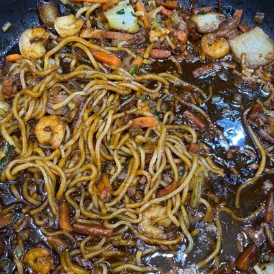 Wanted to like this... but.... two stars because it was "edible", I did eat it... Sauce is strange, not traditional 'lo Mein' flavor, not even teriyaki, but more like barbecue sauce? Noodles were extremely gummy, chewy, not good. A decent amount of shrimp and carrots. If there's another lo mein choice try that, not this. I will not purchase again.