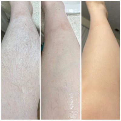 Okay, so I love this and it is a lifesaver for me already. HOWEVER, the directions did not work for me. I had to do some tweaking first. So for me, I had to leave it on for 6 minutes, then wash it off. It would get rid of about 75% of hair. It says not to put it on the same area for a second time, but I did. After that it removed 100% of the hair. I immediately moisturized afterwards, and a few hours later my skin is feeling great, smooth, and hairless. As a woman with PCOS and hirsutism, this is going to be a game changer for me. I don’t mind at all that I have to apply it twice because it’s such a cheap price and is already so valuable to me. I’m going to try the extra strength next to see if maybe that will reduce it to one application. In the photo you will see my before, after first application, and after second application. The reason my skin looks darker is because I was in a different room with different lighting