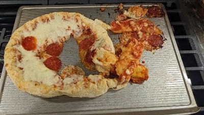 The center of the pizza melted/collapsed and went right through the grate of the oven.
