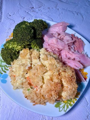 [This review was collected as part of a promotion.] Stouffer‘s chicken and vegetable rice bake is well represented by the photo on the packaging. Even after baking according to the instructions for 75 minutes, it comes out like a loose casserole when you go to serve it on a plate. It’s made with white meat chicken, which was tasty, plus white rice which is sort of flavorless, peas, carrots, celery, and breadcrumbs. The sauce is cheddar cheese based. I’d describe it as a comfort food meal. It was all right, but I doubt I would buy it again. I shared it with someone else who after tasting it said it’s alright. The box label shows it makes 4 1/2 servings. Each serving is very filling.
