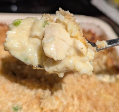 [This review was collected as part of a promotion.] I followed the directions exactly as they are printed on the box, in the oven (there is a microwave option, I thought oven would turn out better). It looks lightly toasted/crispy, but as soon as the spoon breaks that tiny bit of crisp, it’s clear the food is just going to be mush. There is no flavor, aside from the faint bland chicken and cheese flavor. The chicken is also pretty dry. I’m grateful for a warm meal, but I would not recommend this to anyone, nor will I be purchasing in the future.