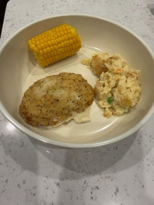 [This review was collected as part of a promotion.] Hight Quality frozen meal realiable option convenient and tasty family dinner easy to prepare good balance of rice and veggies well cooked maintaining their crispiness. Great Quality white meat chicken and chesse sauce carrots,rice and peas . Perfect packing designed for easy store and reheating . I hightly recommend DELICIOUS dish and a GREAT price .