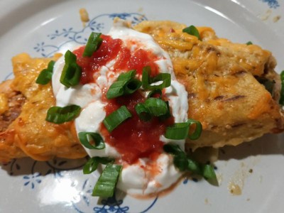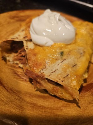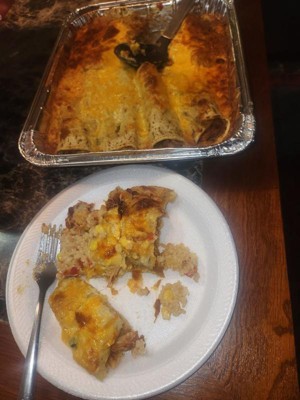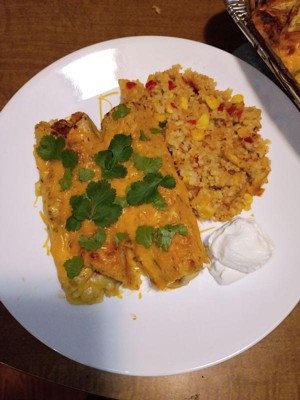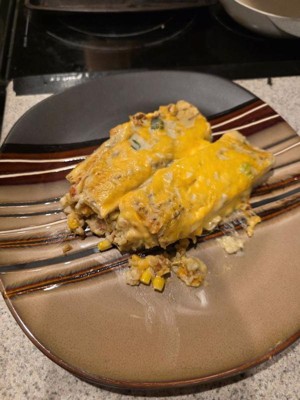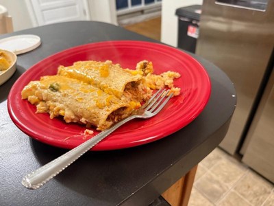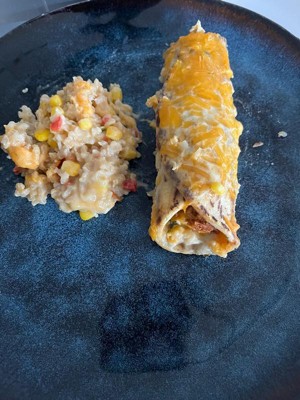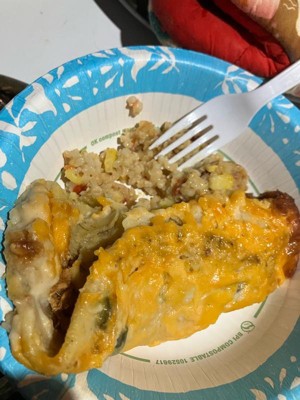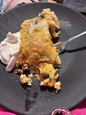 [This review was collected as part of a promotion.] Yummy fast dinner! Topped with some extra cheese and sour cream! 😋 there was enough to feed my whole family which was amazing a lot of times frozen meals are not an option for me because there is not enough in one package to feed everyone.l and it gets costly having to by 2. The filing was delicious with just enough seasonings. I did find the tortillas a tad bit rubbery buy not a dealbreaker considering it’s been frozen. Taste 10/10 I would buy again.