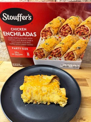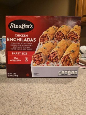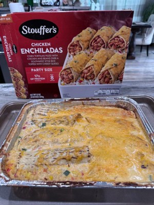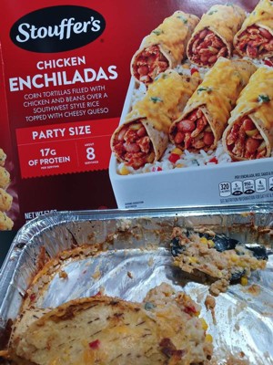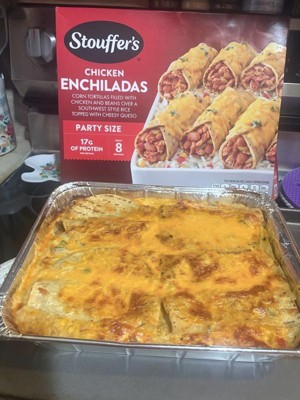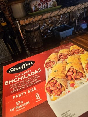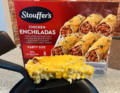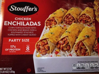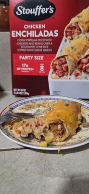 [This review was collected as part of a promotion.] The Stouffers Chicken Enchiladas are really tasty. The party size comes with 8 enchiladas made with corn tortillas filled with chicken and beans over a bed of southwest flavored rice with corn and souces and topped with cheese. Each enchilada is 320 calories with 17 grams of protein. All you have to do is just put in your oven and bake it and it comes out really nice warm and delicious with melted cheese on the top.