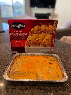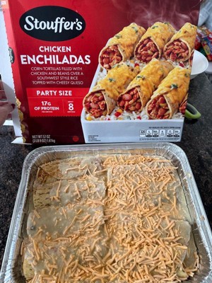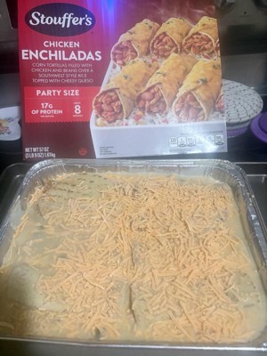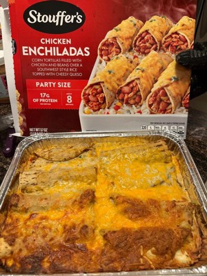 [This review was collected as part of a promotion.] Stouffer's Chicken Enchiladas was loaded with chicken! I expected it to have shredded chicken sparingly as most do, but I was impressed! The oven cook time is 60 minutes, and I uncover them for the last 5 minutes to brown really well. The taste of the rice and queso cheese was restaurant fresh!! The packaging fits perfectly for Stouffer's; I can always recognize the red box with the huge picture of the food on the front! Will I buy it again? Absolutely!! Outstanding filling meal that doesn't break the bank or time restraints!