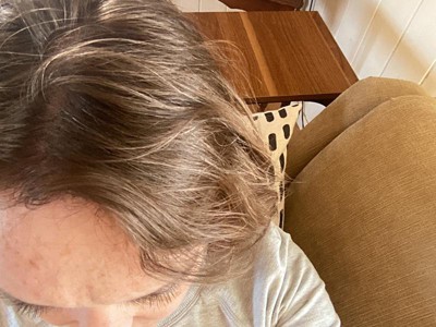 My natural color is I a light brown with red highlights, auburn. This turned my gray roots into a slightly darker version of Lucille Ball’s orange/red color. It’s great if you want to look like a circus clown. 🤡