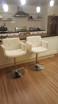 Bought two of these. Arrived in perfect condition. Simple to put together. Fits under kitchen counter or you can raise the seat. Nice motion. High arms make these feel like my favorite arm chair. Very pretty and soft. And they fit everyone in the family! Don't hesitate!