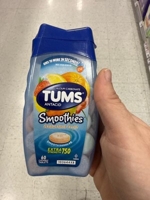 TUMS Smoothies Chewable Antacid Tablets get to work in seconds, so you can forget your heartburn and get back to the moments that matter. TUMS extra strength chewable antacids contain 750 mg of calcium carbonate to quickly and effectively fight heartburn and deliver sour stomach relief, acid indigestion relief and upset stomach associated with these symptoms. These smooth tasting and delicious fruit flavored antacid tablets neutralize acid on contact, giving you fast extra strength heartburn relief. Adults and children 12 years and older may chew two to four calcium antacids as symptoms occur or as directed by a doctor. Known as a trusted brand to fight heartburn fast for 90 years, TUMS is America's #1 antacid and the #1 physician, pharmacist and OBGYN-recommended adult antacid brand. These TUMS antacids come in a resealable bottle that is easy to take on the go in a purse or pocket so you're ready when heartburn strikes. TUMS helps you love food back. *#1 Doctor recommended claim based on IQVIA survey, 2024 1. Consult with HCP on appropriate management of your GLP-1 side effects. Please consult with your HCP before taking this product and use as directed on label. Haleon does not sell, endorse, or promote use of any particular GLP-1 medication.