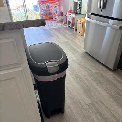 Good trash can so far, keeps my littles from trying to grab things from inside. Also, it's easy to clean, narrow so it can fit in tiny spots. The only thing I recommend is buying in person and make sure to test it out!