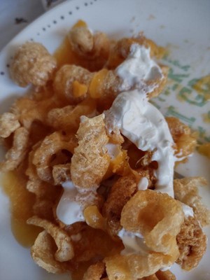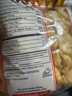 Great gluten Free option for protein! Eat right out of the bag and dip into salsa or make chicharrónes with home made green tomatillo salsa or El Pato Hot Sauce or green enchilada sauce. Low in calories and fat!