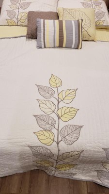 [This review was collected as part of a promotion.] This 5 piece set of quilted coverlet and shams is beautiful. Colored in Creamy white pale yellow with accents of tope this set makes me think of Spring each time I look at it.