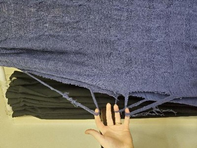 Nice light weight tight knit that would not have a tendency to snag like a looser weave. Does not shed. Love the knit pattern design Unfortunately, the navy blue is not as pictured. Blue looks lighter and faded with definite purple undertones. This was the perfect knit throw I was looking for if it were not for the color. : (