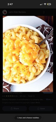 Cheesy macaroni and cheese. Very nostalgic. Taste the same as it did when I was a kid. Super quick and easy side dish to throw together and the kids will love it.