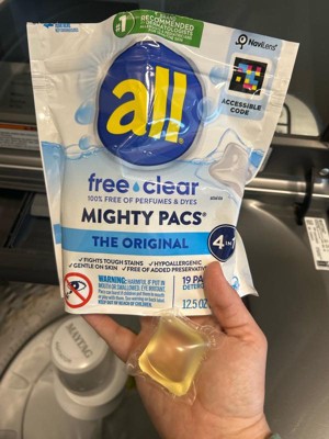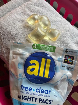 [This review was collected as part of a promotion.] We dont use All detergent but we might be adding it to our laundry. I loved the mighty pacs because they were large and so only one pod needed for a medium to large load. I love that its free and clear of all the bad stuff. My clothes looked great after washing with the All mighty pacs. You get a really good clean and i dont have to use multiple pacs to get the job done. The resealable bag makes it easy to store and keep out of reach but easy to grab when needed.