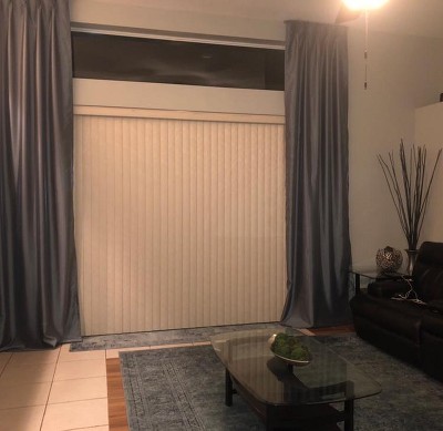 Beautiful shimmery blue curtains. They only filter the light but that’s all I wanted.