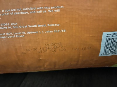 I bought it Jan 29, 2026, and the product arrives Jan 31, 2026. However, it is expired by Oct 7, 2026. Very frustrated.. Now I have to carry the 22lb bag back to the store for return.