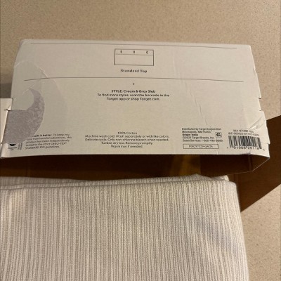 Not off white in color. The label on the actual shower curtain says cream and gray. That wasn’t in the product description online at all. The product description also doesn’t say there are very obvious gray stripes.