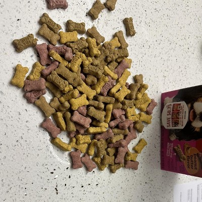 Milk Bone peanut butter minis are my dogs’ go to favorite treat. They are just the right size for small mouths and made by a company I’ve trusted for a long time. They love the peanut butter flavor the best. Certainly a better value than other comparable brands.