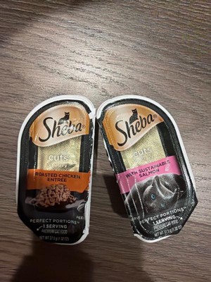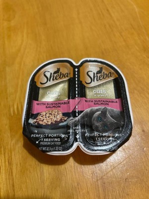 • Twin-Pack Tray: Contains one (1) 2.6 oz. twin-pack tray (2 servings total) of Sheba Perfect Portions Wet Cat Food Cuts in Gravy With Sustainable Salmon.