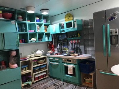 I confess that I get a huge kick out of finding realistically detailed accessories for my 18in dolls and this set is packed with them! I don’t know which is my favourite item, the teeny pastry brush with soft bristles, the little spatula or the tiny perfect set of measuring spoons. The cookies and brownies are deliciously detailed and a stand mixer that actually turns the interchangeable beaters is the icing on the cake (so to speak). There is so much to play with here.