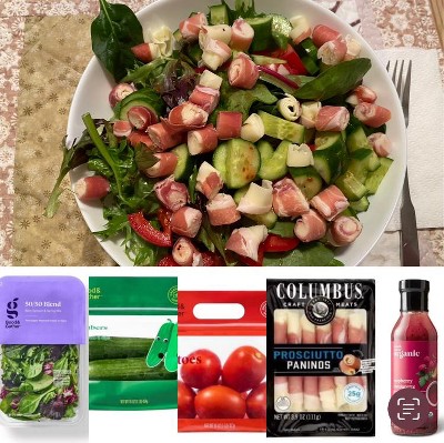 I really enjoy these my husband and I will share them as a snack, or as in the photos I will cut them up and add them to the salad for the 25 grams of protein maki g it a complete meal. This is only 3 of the 10 ounces of salad in the container. This is a 9" Bowl I love that the salad cleaned, and ready to use. Has a nice variety of greens including fresh spinach. I chopped Roma Tomato, two of the Mini-Cucumbers and topped it off with a little Good, and Garher Raspberry Vinaigrette. it's really a full meal