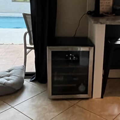 I've been looking to buy a small wine fridge for a while now and couldn't seem to get everything I was looking for until I found this! It's compact, stylish, has "wood" front shelves and stainless steel door. It looks more expensive than it is and it holds 25 bottles. I tried to include pictures others hadn't shown in their reviews: the bottom shelf, with the wood and metal shown, the way 4 bottles have to sit on top of the 5 bottles on the top shelf to get 25 bottles, the notch where the shelves rest; which is sturdy and provides a resting place when the shelf is pulled out as well. The top shelf can hold champagne bottles instead of 9 regular bottles as it has the most vertical space of all the shelves. The second and third shelves hold 5 bottles each but do need to be pulled out to get the bottles out (which is fine; the shelf is sturdy enough to do so and it has a notch to hold the shelf from falling out). The bottom shelf holds 6 bottles. The fridge arrived flawless; no shipping issues and it arrived in 2 days. It was cold within 2-3 hours of plugging it in. I have it set to the coldest setting (7) and it holds at 39° which is good for me. I'm very happy with this purchase and would recommend it to friends. I reversed the door hinge so it opens on the left side and that was easy as well. The fridge is basically silent. It doesn't come "on" very often and when it does; I've only heard it when I was sitting in silence. There are two leveling feet on the bottom front of the fridge to make sure it sits flat on your floor - which is good because I'm in an apt and my kitchen floors are warped.