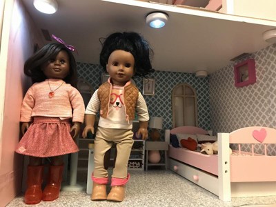 Disappointed that the boots are very very hard to get on the doll. My granddaughters have an Our Generation doll as well as an American girl doll which these outfit should fit. Most of the outfits are fine to fit both dolls. Some of the shoes do not. Makes me think twice purchasing these outfits in the future as it really disappoints the girls. Sad faced emoji.