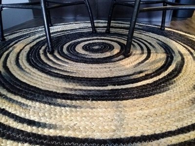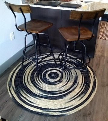 Just got the 4' round rug in grey today and I absolutely love it! It is definitely more black than grey, but it still works beautifully with our decor. Needed a rug to go under our apartment's island bar, and we were able to fit, (and sit,) in two swivel bar stools comfortably! The texture is surprisingly soft for a natural fiber rug; it feels pleasant to walk on with bare feet. Very quick shipping with UPS, and they delivered right to our apartment door, (no trips to the post office!) I haven't tried cleaning it yet, but it seems sturdy enough for life's occasional spills. I paid $50 for it, and feel like that is a reasonable price for such a unique piece.
