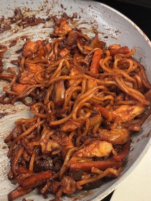 Do not buy! Dark color of sauce does not match photo or any good LoMein I have had at restaurants, and tastes horrible - no specific flavor, just dark -- soy sauce? Also felt as if some of the chicken pieces were not cooked throughly. Followed the cooking time, stirred, put chicken against bottom of pan. Is the chicken raw in this recipe?