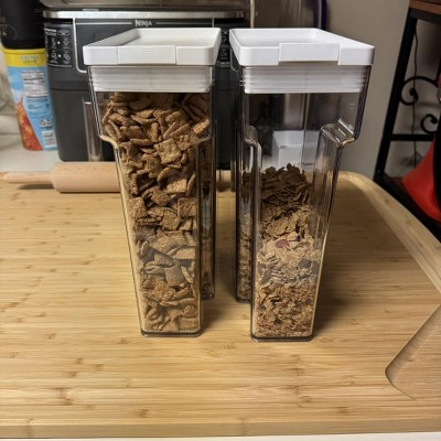 These containers are just what I was looking for to keep my cereal fresh!!! Crystal clear, air tight, and holds a lot!! No more unsightly cereal boxes on the fridge 😂