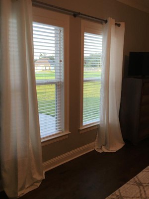 I almost didn’t hang these because the fabric does have a bit of shine, which I don’t love. However, once up in my south facing window, where there isn’t bright light coming from inside the room, they just look crisp and white. My 6 panels were all the same length and were easy for me to shorten to fit my window (I purchased the 96” length and needed to shorten them to about 92”).