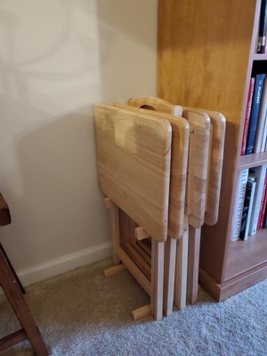 I wanted snack tables for when guests are here. Something sturdy to set drinks on. I am very happy with these tables. They look the part and I am finding them useful as craft tables as well . The stand was well tooled and fit together very easily. They tuck easily away in the stand when not in use.