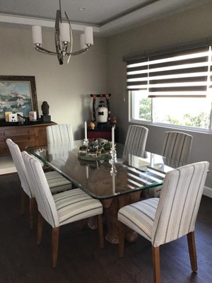 The chairs are relatively easy to assemble and look amazing with our new glass top dining table. The stripe color is a soft teal rather than blue which is exactly what I was looking for. I would definitely buy these chairs again.