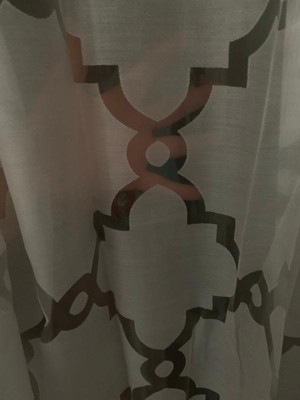 [This review was collected as part of a promotion.] I like this panel. It is a silver sheer that I put in my bathroom. The holes on the top are big for a nice fancy bar to put on. I like the pattern that it is nice circles an nice shiny sheer.