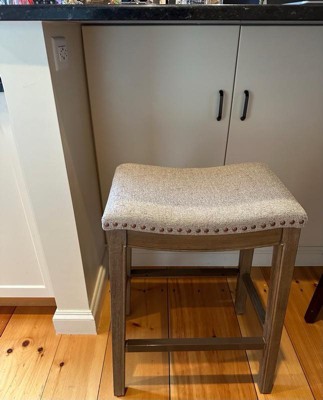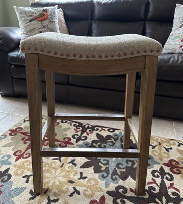 Update your living space with the Westly Saddle Counter Stool. It reinvents the familiar lines of classic Italian design. This stool features an upholstered seat in a linen hue fabric with bronze nail head accents. The saddle stands on smooth birch wooden legs in reclaimed natural finish. Assembly required and tools included. Assembly required and tools included.
