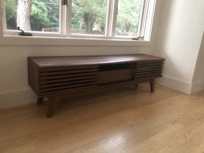 Tap into mid-century aesthetics with the Render 59” TV Stand. Render features a durable particleboard frame with smooth walnut grain laminate, four tapered wood legs, full-extension center drawer with shelf on top, non-marking foam foot pads, and opposite side adjustable shelves with dual slatted sliding doors for sophisticated media storage. Complete with a center cable management hole, Render’s contemporary linear style is the perfect addition to the modern living room, lounge or recreation area. Overall Product Dimensions: 13.5"L x 58.5"W x 17"H