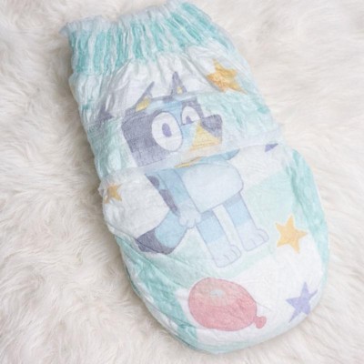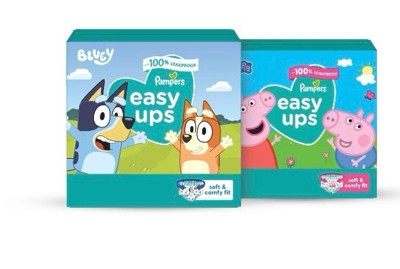 Ready to potty train with Bluey? Pampers Easy Ups Training Pants featuring Bluey makes it easy. They pair the feeling of real underwear with the protection of Pampers to make training easier for everyone. Give your child the confidence to take on potty training with a little more independence and a lot more fun. Easy Ups Training Pants feature stretchy sides and an underwear-like waistband for easy up and down, plus an ultra-absorbent core with LockAway Channel to help keep them dry day and night. With up to 2X better protection day and night*, Easy Ups deliver up to 100% leakproof protection. These hypoallergenic, dermatologist-approved training pants are made with 0% elemental chlorine, parabens, or latex** and backed by the Pampers Safety Promise. Fun Bluey designs motivate your toddler to potty train. Pampers Easy Ups are also available with Peppa Pig! Pair with Pampers Sensitive Wipes to help keep your toddler's skin healthy. Find your toddler's best fit in the following sizes: training pants 2T-3T (diaper size 4,15-34 lbs.), training pants 3T-4T (diaper size 5, 20-40 lbs.), training pants 4T-5T (diaper size 6, 23-50 lbs.), training pants 5T-6T (diaper size 7, 35-60 lbs.), training pants 6T-7T (diaper size 8, 46+ lbs.)