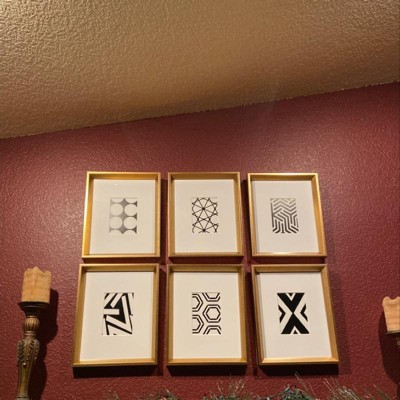 Create a stunning wall gallery in your home with this 6pc black and white framed print art set. Each of the 6 black picture frames comes filled with a crisp white beveled mat framing a black and white geometric art print and protective glass. Each frame measures 12.25 inches by 15.25 inches and is 1.75 inches deep. If you choose to follow the included hanging template to display three frames across and two frames high, the approximate outer dimensions will be 40.4 inches across and 32 inches high. The border of each frame is 0.75 inches wide. The glass is 10.5 wide and 13.5 high, and the framed print is 4.5 inches wide by 6.5 inches high. This modern art set is the perfect addition to your modern home wall gallery.