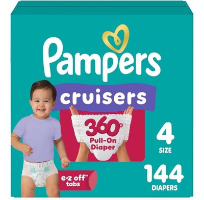Pampers Cruisers 360 degrees pull-on diapers are hypoallergenic, dermatologically tested, and free of parabens and latex*